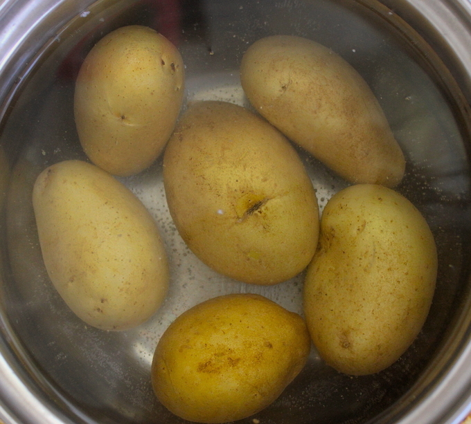 - Naast bieten moet je ook aardappelen koken. Je hoeft hem niet schoon te maken, we koken hem direct met de schil. Spoel de aardappelen goed af en kook ze in kokend water tot ze zacht zijn (probeer de aardappelen niet te gaar te koken, anders vallen ze uit elkaar). Koel en schil.