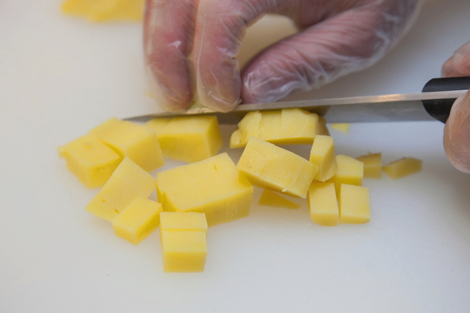 - Snijd de geschilde aardappelen in kleine blokjes die even groot zijn als haringblokjes.