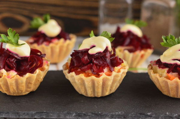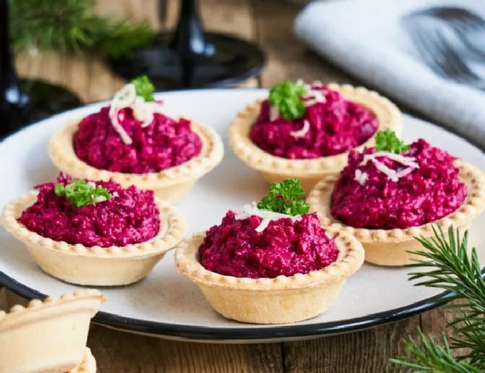 Een zeer interessante en ongebruikelijke optie om haring onder een bontjas te serveren. Fijne aardappelmandjes passen goed bij de vulling van biet en vis. Deze salade staat prachtig op elke feestelijke tafel.