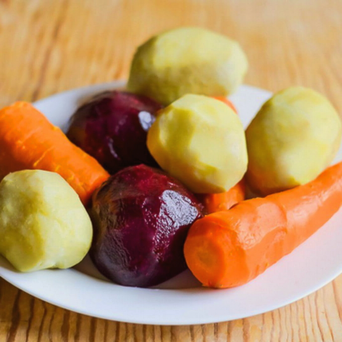 - Voordat je de salade gaat koken, moet je alle groenten koken. Spoel de bieten, aardappelen en wortelen goed af onder stromend water. Kook de aardappelen en wortelen apart van de bieten tot ze zacht zijn (30-40 minuten), de bieten zullen veel langer koken - 1,5 uur, of zelfs 2. Nadat de groenten klaar zijn, giet je het water er voorzichtig uit en geef je ze aan de bieten, wortelen en laat de aardappelen afkoelen.
