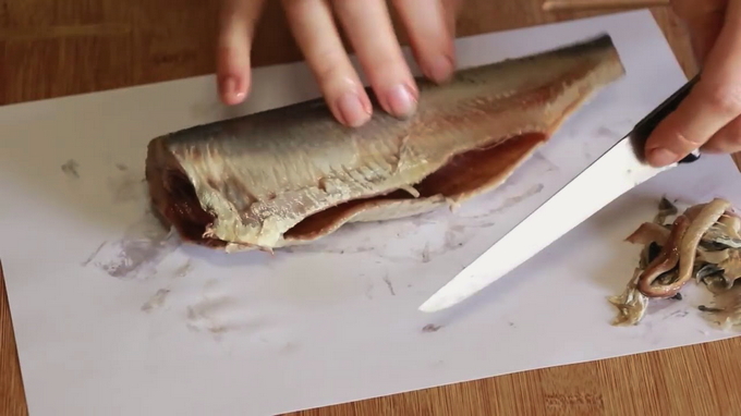 - De haring moet in kleine stukjes worden gesneden, terwijl de botten (indien aanwezig) worden verwijderd.