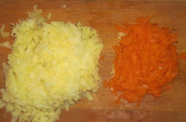 - Schil de aardappelen en wortelen en rasp ze apart op een grove rasp.