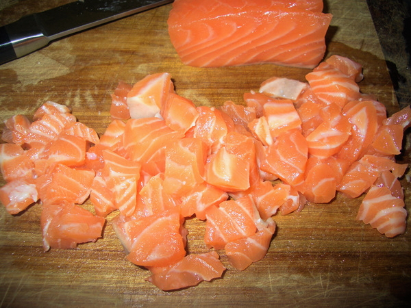 - Verwijder de botten van de zalmfilet en snijd de vis in kleine blokjes.