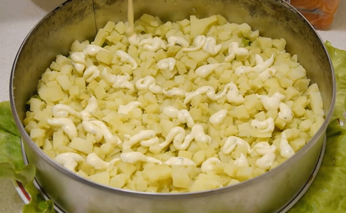 - Leg de geraspte aardappelen in de derde laag. Deze laag moet ook 2-3 centimeter smaller zijn dan de wortellaag. Bedek ook de bovenkant met een laag mayonaise.