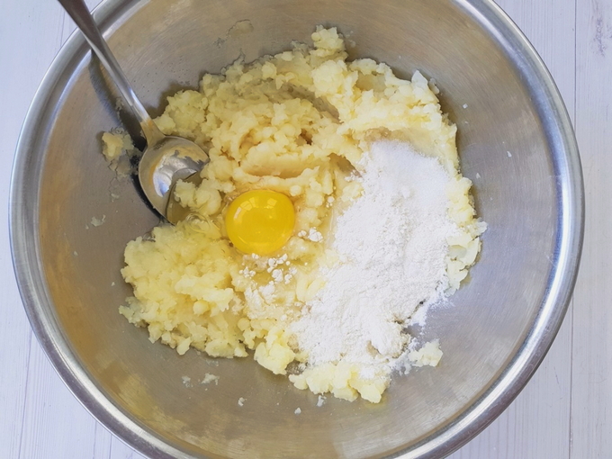 - Zeef 120 gram bloem in een kleine kom (misschien heb je iets meer nodig), voeg geraspte aardappelen en een beetje zout naar smaak toe. Klop er een kippenei door (voorgeklopt met een vork gedurende 1 minuut) en meng alles goed. Je zou een mooi deeg moeten hebben. Rol het tot een bal, wikkel het in huishoudfolie en zet het 30-40 minuten in de koelkast.