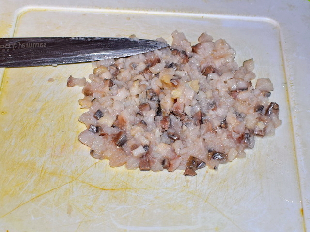 - Inspecteer de haringfilets op botten en verwijder ze indien aanwezig. Snijd de vis in kleine stukjes, niet meer dan 0,5 millimeter dik.