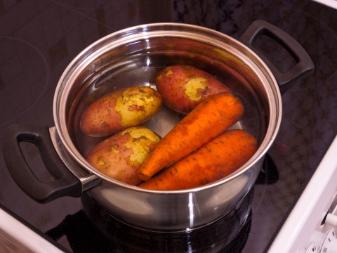 - Aardappelen en wortelen heel goed afspoelen onder stromend water en koken tot ze zacht zijn. Wees voorzichtig met deze groenten, ze koken veel sneller dan bieten en kunnen gewoon uit elkaar vallen als ze te gaar zijn. Als zowel de wortelen als de aardappelen gaar zijn, giet je het water af en leg je ze op een bord om verder af te koelen.