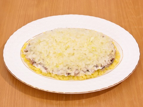 Bovenop de haring worden gestoomde uien gelegd, waaruit je het water heel goed moet aftappen, zodat het de consistentie van de salade niet bederft. Van bovenaf bedekken we alles weer met een net van mayonaise.