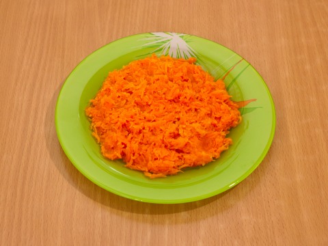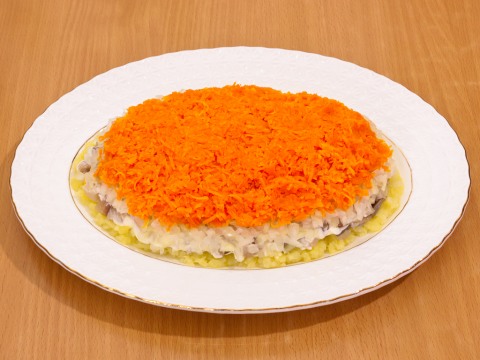 De vierde laag is een heldere en zoete wortel, die, net als alle voorgaande ingrediënten, moet worden ingevet met een laag mayonaise.