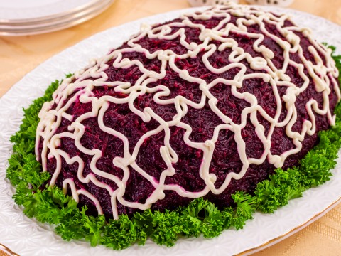 - Alles is klaar, het is tijd om de salade in lagen te verzamelen. Leg eerst een laag geraspte aardappelen op een langwerpig bord. Giet er een laag mayonaise op (je kunt een gaas maken, of je kunt het voorzichtig uitsmeren). Dit wordt gevolgd door een laag fijngehakte haring, besprenkeld met mayonaise. Leg na de vis een laag uien met een mayonaise-gaas. De vijfde laag zijn geraspte wortelen, die ook bedekt moeten worden met een laag mayonaise erop. De zesde laag is geraspte appels en een net van mayonaise. Bieten worden in de allerlaatste laag gelegd en bedekken alle voorgaande lagen volledig. De bovenkant van de salade kan worden versierd met mayonaisegaas en verse kruiden.