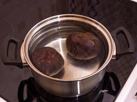 - De eerste stap is het koken van de bieten (dit kun je het beste vooraf doen, bij voorkeur 's avonds). Spoel het onder stromend water af en doe het in een kleine steelpan. Giet genoeg water over de bieten om de groente met ongeveer 2-3 vingers te bedekken. Breng het water aan de kook in een pan en zet het vuur lager. Bieten worden matig gekookt tot ze zacht zijn (ongeveer 1-1,5 uur). Als de groente gemakkelijk met een vork te doorboren is, is hij klaar. Zorg ervoor dat het water niet kookt, anders koken de bieten ongelijkmatig. Verwijder na het koken de gekookte groente op een bord en laat afkoelen.