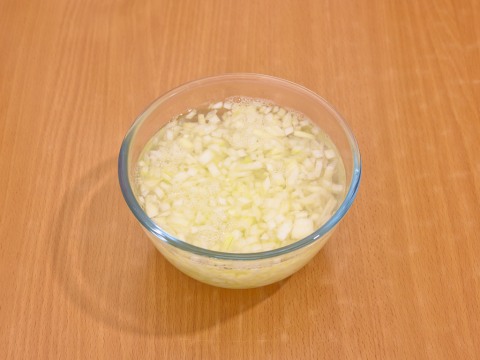 Schil de uien, spoel af onder de kraan en snij in kleine blokjes. Doe de gesnipperde ui in een kom en voeg een glas kokend water toe. Laat de ui ongeveer 10 minuten sudderen (dit zal helpen overtollige bitterheid van de ui te verwijderen). Giet het water af.
