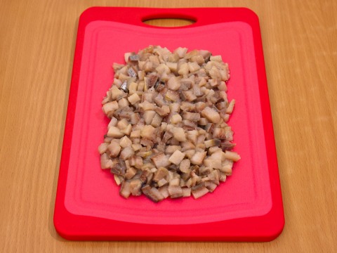Het was de beurt aan de haring. Eerst moet u het inspecteren op de aanwezigheid van kleine botten en, indien aanwezig, deze verwijderen. Snijd vervolgens de haring in smalle reepjes en de reepjes in kleine blokjes.