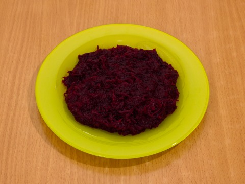 - Haal de gekookte bieten uit de koelkast en schil ze. Rasp op een fijne rasp.