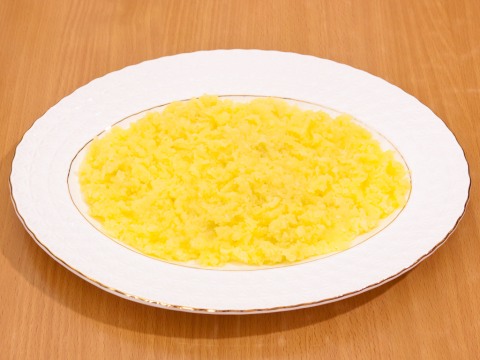 - Leg de geraspte eieren op de aardappelen, 2-3 centimeter verwijderd van de vorige laag. Bedek de eieren met een mayonaisenet.