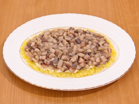 - Leg een laag haring op de ui, en geraspte aardappelen met mayonaise erop.