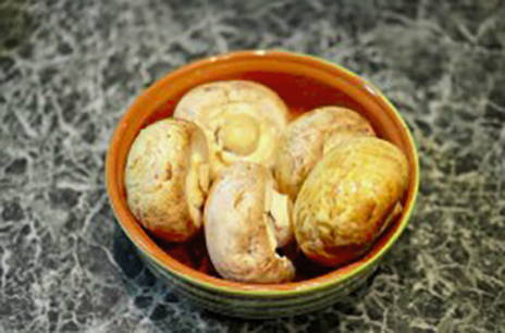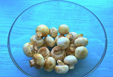 - Was de champignons en dep ze droog met keukenpapier. Snijd de stelen af en doe de champignons in een kom.
