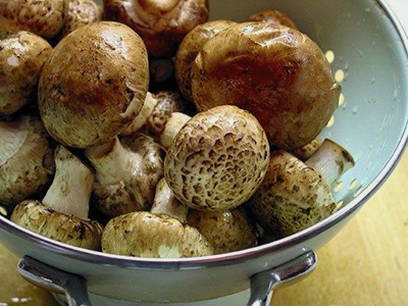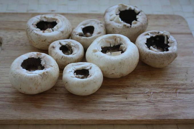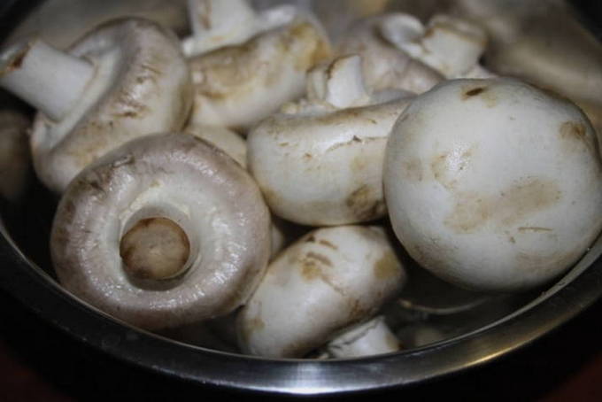 - Raap grote champignons op, ongeveer even groot, was ze, droog ze en snijd de poten eruit.