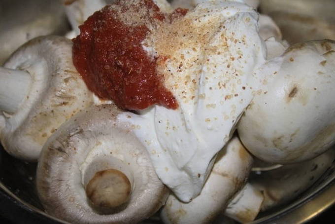 - Breng de champignons over in een kom, voeg zure room, tomatenpuree en zout toe, meng.