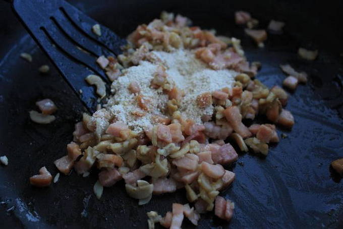 - Hak de ham en champignonpoten fijn, bak ze 3-4 minuten in plantaardige olie. Voeg vervolgens het paneermeel toe, roer en haal van het vuur.