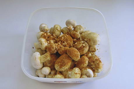 - Voeg ook gehakte knoflook, zout en kruiden naar smaak toe, roer en laat de champignons 10-15 minuten marineren.