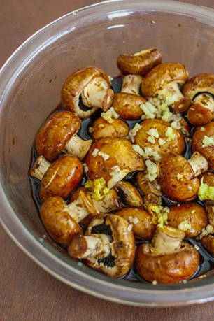 - Giet de resulterende marinade over de champignons, meng en laat 15 minuten staan.