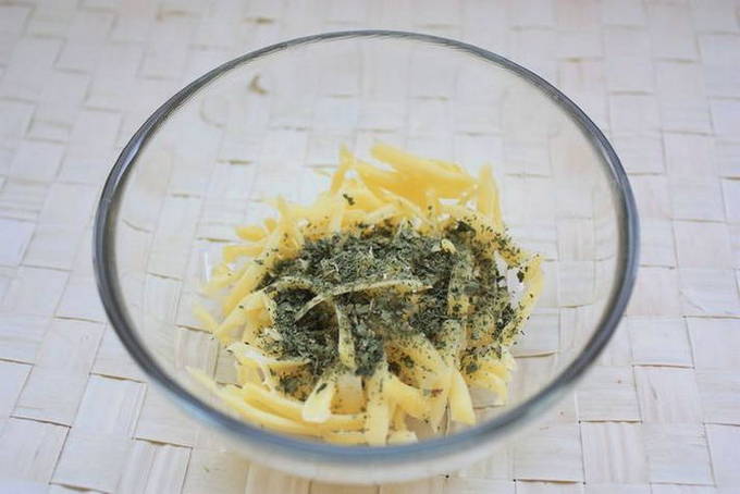 - Rasp kaas, meng het met gedroogde basilicum.
