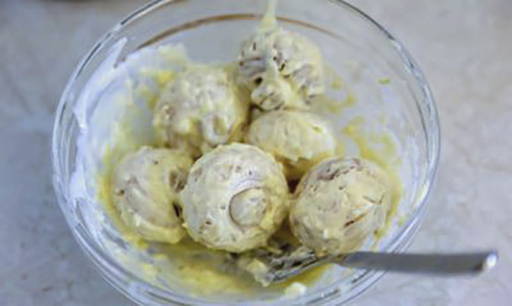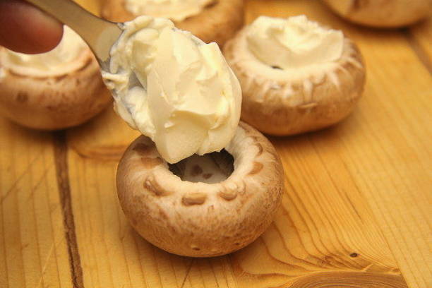 - Doe een theelepel roomkaas in elke dop champignons.