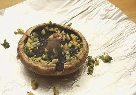 - Leg de champignons met de hoed naar beneden op de folie en leg er een beetje knoflookmengsel op.
