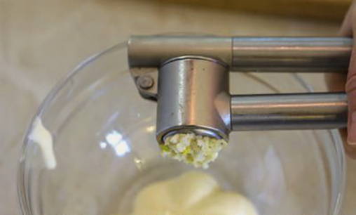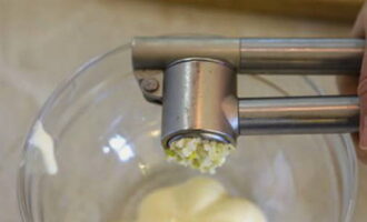 Pel de knoflook, passeer door een pers en voeg toe aan de marinade.