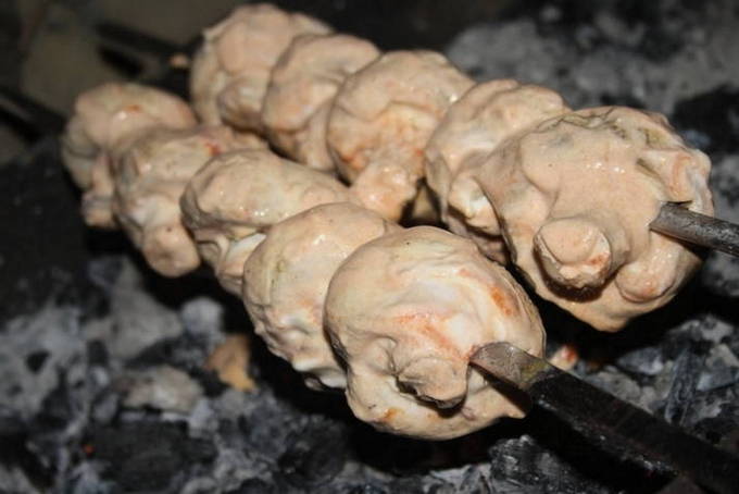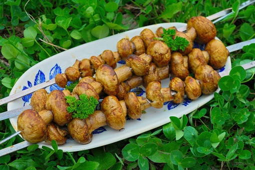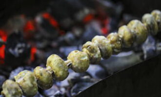 - Rijg daarna de champignons aan spiesjes of spiesjes, bak ze op de grill, draai ze regelmatig om en giet er marinade op.