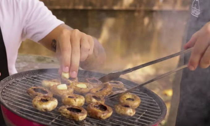 - Leg de stukjes op een rooster en leg ze op de hete kolen. Bak de champignons 5-7 minuten aan elke kant.