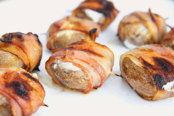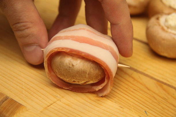 - Wikkel de champignons vervolgens in plakjes spek en zet ze vast met spiesjes.