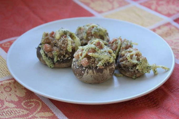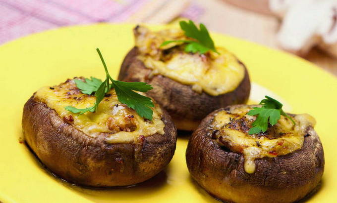 Geweldig gebakken champignons met vulling kunnen als bijgerecht of als apart gerecht worden geserveerd. Kaas, ham, groenten en kruiden zijn het beste voor de vulling.
