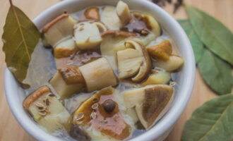 - Voeg kruiden en mosterd toe, roer goed. Laat de champignons 15-20 minuten marineren.