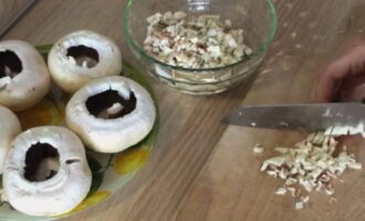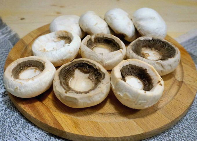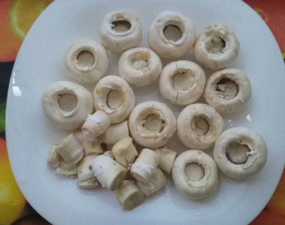 - We kiezen champignons met grote mooie hoeden om te vullen en beginnen met koken. We wassen de champignons onder koud stromend water en drogen. We verwijderen de film van de poten en verwijderen voorzichtig de poten van de doppen. Onze vulmanden zijn klaar.