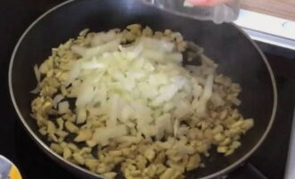 - Haal de gekookte uien met champignons van het vuur, doe ze in een kom en laat ze iets afkoelen. Voeg gehakte kip en knoflook toe.