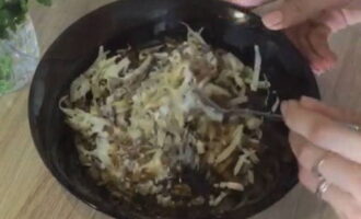 Voeg kaas en zure room geraspt op een grove rasp toe aan de champignons. Wij mixen. De vulling is klaar.