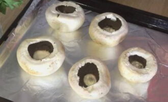 Bedek de bakplaat met folie, ingevet met een beetje plantaardige olie, en leg de hele champignonhoeden neer.