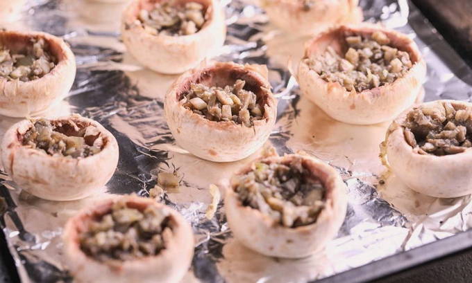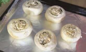 - Vul de champignonhoedjes met de voorbereide vulling. We doen dit zorgvuldig en zorgvuldig, waarbij we proberen de dop niet te breken en er zoveel mogelijk vulling in te doen. We verspreiden de gevulde champignons op een bakplaat, die we afdekken met geoliede folie.