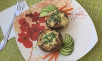 - We zetten de bakplaat met champignons in de oven, die was voorverwarmd op 200 graden. We bakken ons gerecht 20-25 minuten zodat de kaas helemaal gesmolten is en mooi bruin wordt. Leg de afgewerkte champignons op een schaal, versier met kruiden naar smaak en serveer.