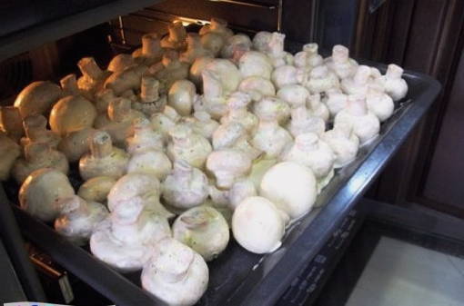 - Verwarm de schaal waarin we de champignons gaan bakken lichtjes, doe de ingelegde champignons erin en zet 20 minuten in een op 170 graden voorverwarmde oven. Tijdens het bakken is het raadzaam om de champignons 2-3 keer te mengen.