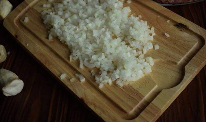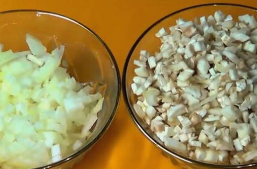 - Laten we voor de vulling zorgen. Hak de champignonpoten fijn. Schil en snij de ui in kleine blokjes.