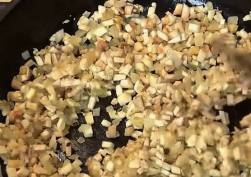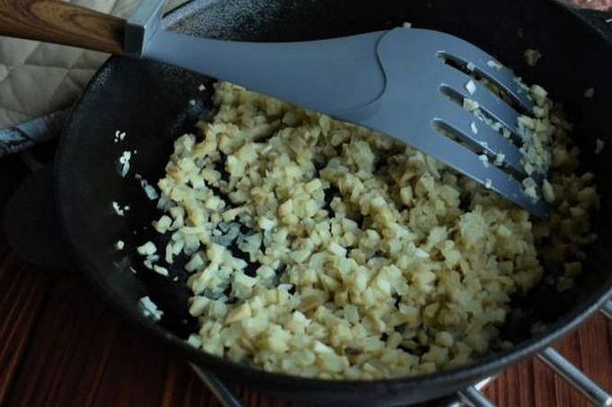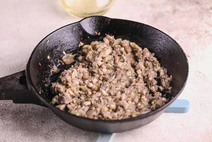 - Snijd de champignonpoten in kleine blokjes en stuur ze naar de pan, waar we de uien en knoflook bakken. Hier voegen we de pulp toe die uit de doppen is gehaald. Zout en peper naar smaak en bak de vulling tot het vocht van de champignons volledig uit de pan is verdampt.