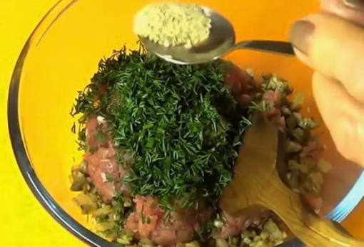 - Kruid de vulling met zout en gemalen zwarte peper. Voeg fijngehakte dille toe. Je kunt desgewenst andere favoriete kruiden toevoegen.
