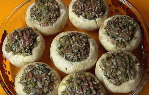 - Leg de ingelegde champignonhoedjes in een ingevette ovenschaal en vul met de voorbereide vulling. We bakken de champignons 40 minuten in de oven op 200 graden.