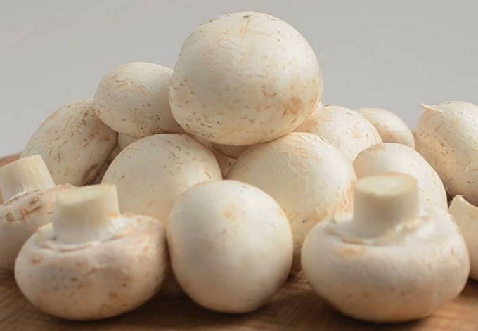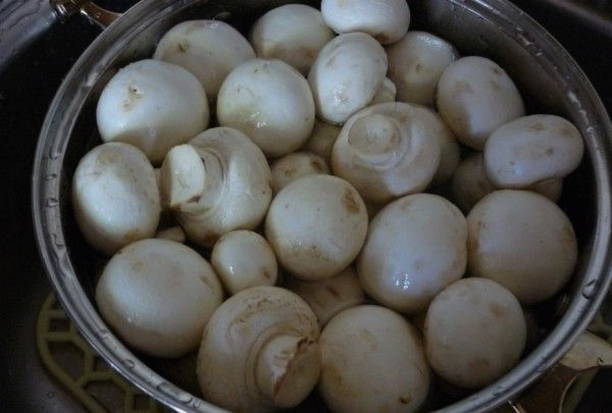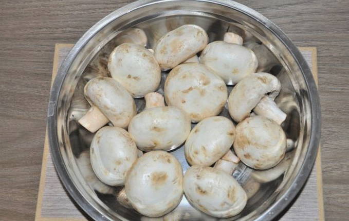 - Kies voor het braden van geheel middelgrote champignons. We wassen en deppen ze met een servet of handdoek, snijden het been een beetje af. De op deze manier bereide champignons doen we in een diepe bak, waar we ze gaan marineren.