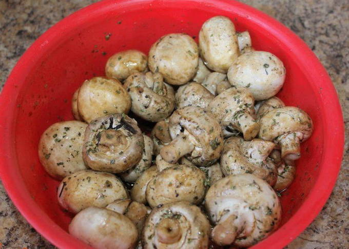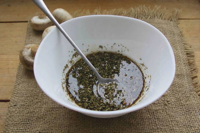 - Doe de gewassen en gedroogde paddenstoelen in een bak met marinade, roer en laat ongeveer 40 minuten marineren. Roer de paddenstoelen gedurende deze tijd meerdere keren zodat ze goed gemarineerd zijn en verzadigd zijn met de aroma's van kruiden.