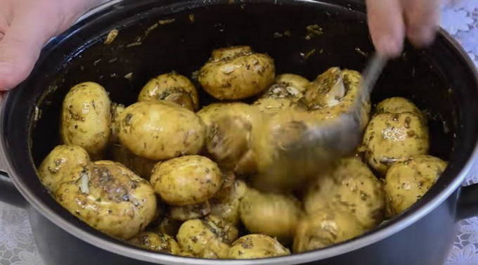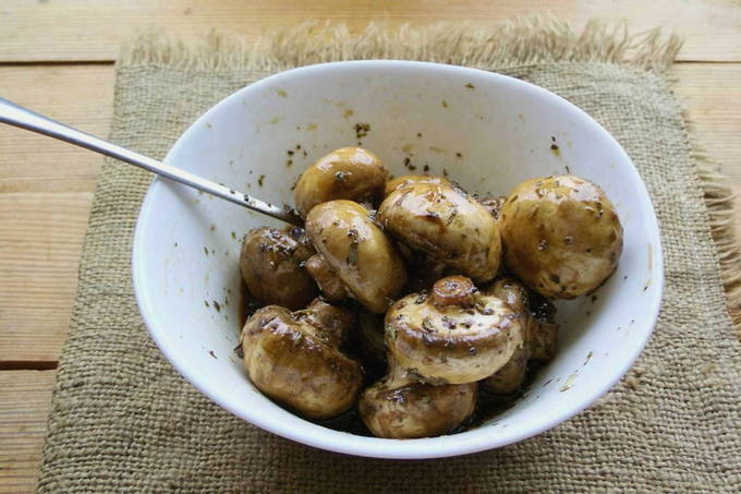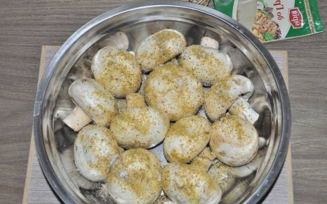 - Zout en peper de champignons, voeg kruiden toe. In plaats van een mengsel van Provençaalse of Italiaanse kruiden, kun je kruiden naar eigen smaak toevoegen. Meng de champignons goed en voorzichtig met je handen.