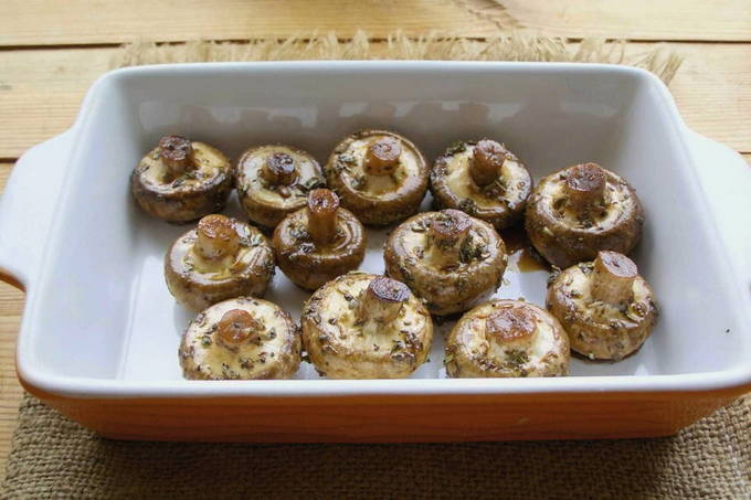 - In een vorm met een kleine hoeveelheid plantaardige olie, leg de champignons met de dop naar beneden en zet ze 25 minuten in een voorverwarmde oven op 180 graden.